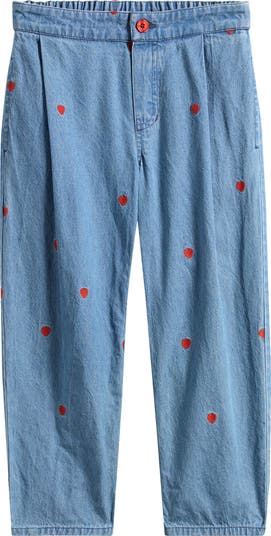 Embroidered mini hearts dot pleat-front jeans made from nonstretch organic-cotton denim for a sweet and comfortable look.