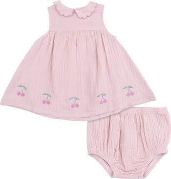 A scalloped collar and embroidered cherries sweeten this sleeveless dress and bloomers set that will keep them cool in breathable organic cotton muslin.