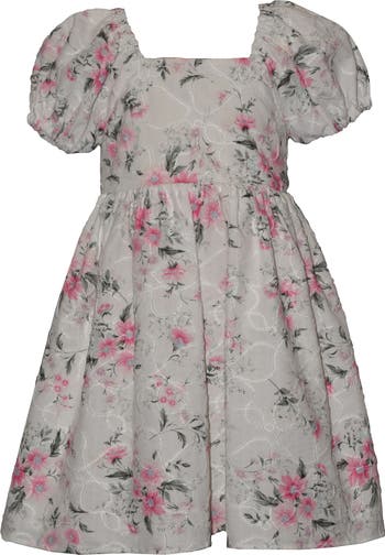 Watch them twist and twirl in this floral party dress featuring tonal embroidery, playful puff sleeves and a floaty skirt.
