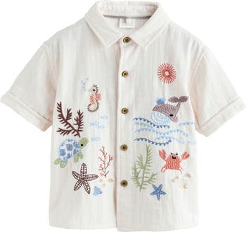 Under-the-sea embroidery brings a splash of fun to a shirt designed for kids who like to swim through life in the comfort of gauzy, richly slubbed cotton. The roomy fit and brushed finish make it an easy favorite on any sunny day.