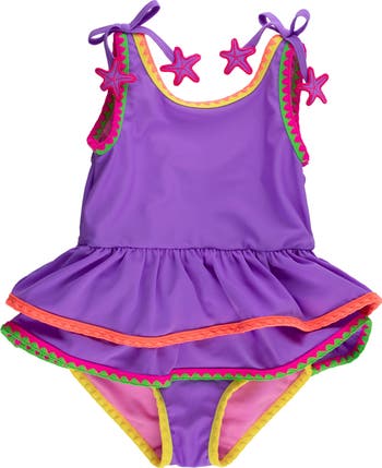 Your little one will look their cutest in this colorful one-piece swimsuit made with colorblocked binding, embroidered trim and a playful tiered skirt.