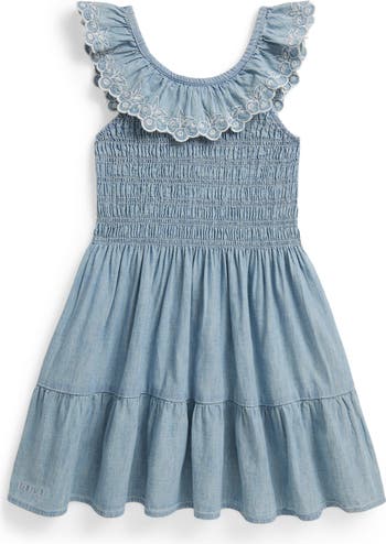 Supersweet blueberries are embroidered along the ruffled neckline of this chambray sundress made with a comfortable smocked bodice and convenient pockets.