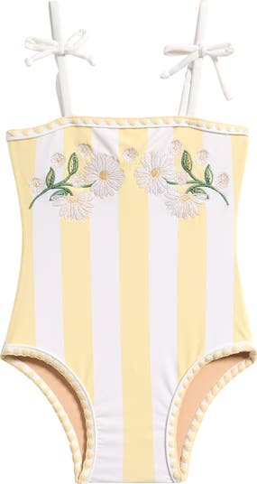 Watch your youngster splash and play in this one-piece swimsuit made with bow-topped straps and colorful embroidery.