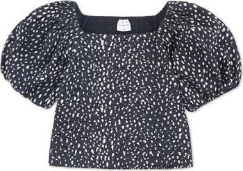 They'll love the playful puff sleeves framing this pleated poplin top with a comfortable smocked panel in the back.