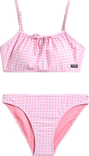 Your favorite youngster will be ready to splash and play in this matching two-piece swimsuit made with a little bow at the front and a sweet gingham print.