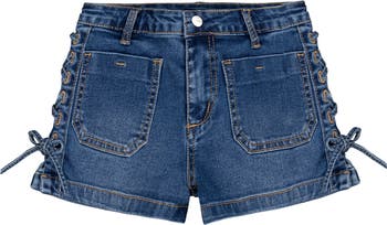 Amp up your kid's weekend style with these denim shorts cut from stretch-kissed cotton and charmed with side lace-up detail and patch pockets.