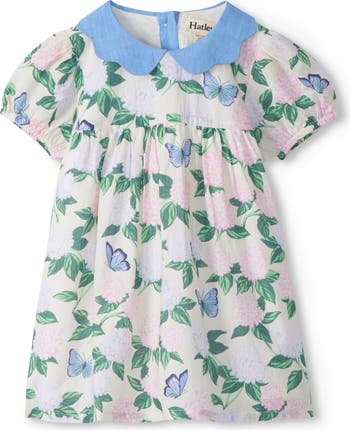 A contrast collar with wavy edges tops this breathable cotton dress featuring faded blooms and sweet butterflies all over.