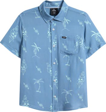 Skull and surf graphics pattern this short-sleeve button-up shirt designed for your kid who likes beach style with an edge.