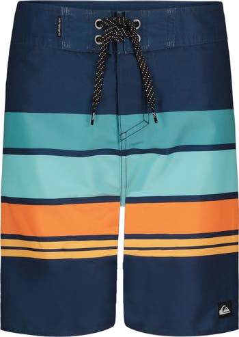 Mixed stripes brings a bold splash of color to these kid-approved board shorts crafted from a supersuede-like fabric that repels water for durability.