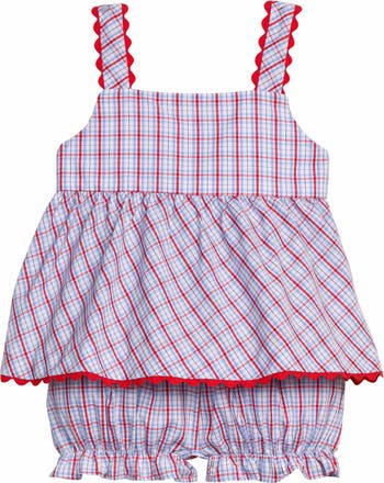 Our Evie Bloomer Set features ric rac along the straps and hem, an adjustable knotted bow in the back, and coordinating bloomers with ruffle detailing at the legs; this set is sure to be a standout!