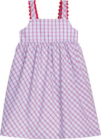 Our Evie Dress is a beautiful silhouette that features ric rac along the straps and an adjustable knotted bow in the back; this dress is sure to be a standout! And baby sister can perfectly match in our Evie Bloomer Set.