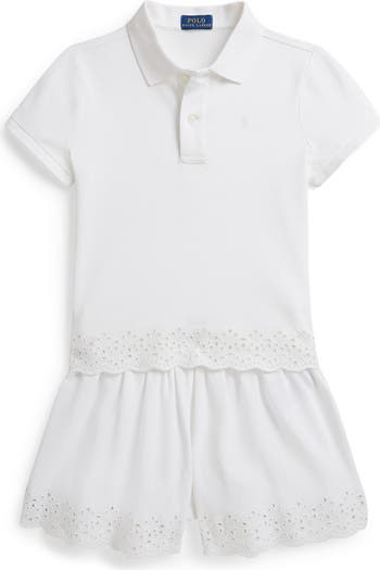 Polo style gets prettier in a shorts-and-shirt-set trimmed in dainty eyelet stitchwork.