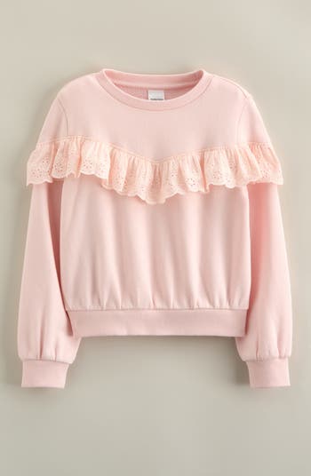 A fluttery ruffle detailed with tonal eyelets moves as your kiddo runs and plays in this precious cotton-blend sweatshirt.