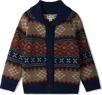 A vintage Fair Isle design in rich hues lends appeal to a cozy cardigan framed by roomy raglan sleeves and a ribbed blade collar.