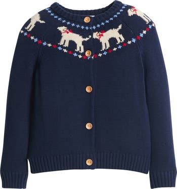 - Add layers in classic LE style! This cardigan features a fair isle design at the collar and wooden buttons down the front.