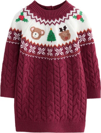 Your kiddo will love this lively sweater dress featuring a classic Fair Isle pattern that's perfect for wintertime wear.