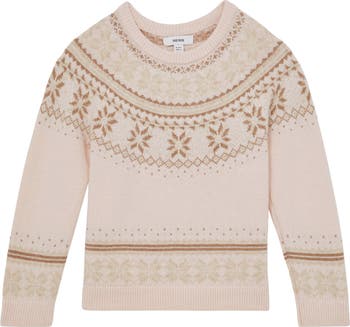 Nailing après-ski style is a cinch thanks to this kid-sized raglan-sleeve sweater that's knit in a snowflake Fair Isle motif from cozy-soft yarn blended with cotton and wool.