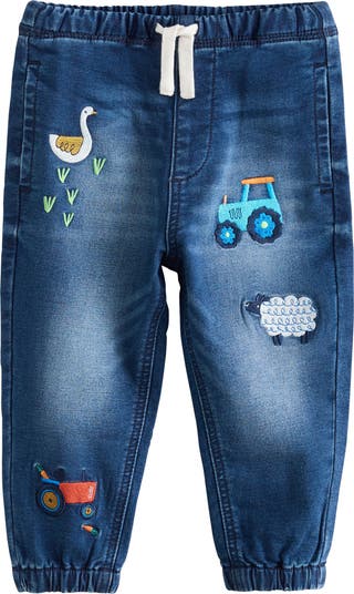 Ready, set, yeehaw—these supersoft jeans turn every hallway into a happy little homestead with tractors, geese and fluffy sheep stitched from cuff to pocket. A pull-on waist and bouncy cuffs make quick getaways from the pretend barn a breeze.