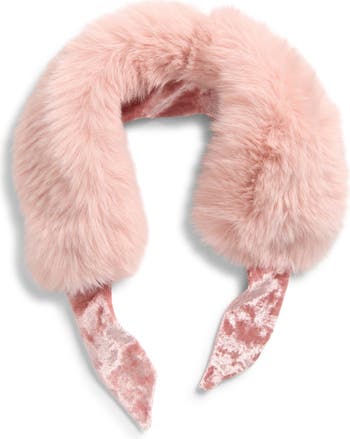 This plush faux-fur scarf with silky ties, all in a soft pink hue, is sure to be a sophisticated accessory for the winter season.
