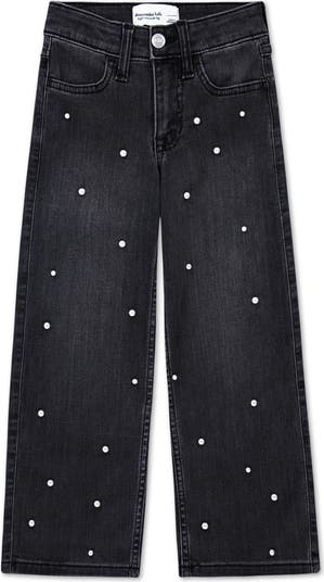 Faux pearls shine like stars in the night sky against the midnight-black wash of these kid-sized jeans cut from stretch-kissed denim in a high-waist, wide-leg silhouette.