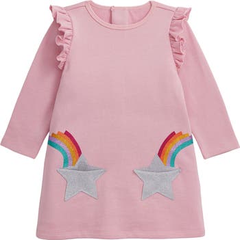 Sparkly rainbow-star pockets bring a dose of dazzle to this tot-sized cotton dress trimmed with shoulder ruffles and shut with the brand's signature magnetic closures.