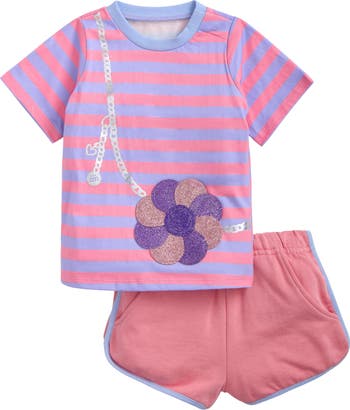Your little one will be ready for play time in this colorful set featuring stripe-trimmed shorts and a flower-embellished T-shirt with a magnetic closure for easy on and off.