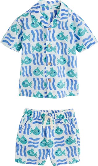 Green fish and blue waves add a bright, beachy splash to a kids' linen-cotton camp shirt and matching shorts that bring sunny-day comfort to any activity. They work great together and pair separately with other funtime favorites to let you mix and match for playtime and downtime.