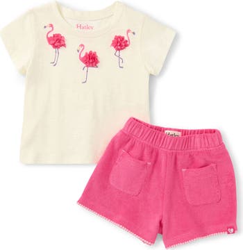 Your little will be looking their cutest in this coordinating set featuring a cotton T-shirt featuring flamingos on the front and a shirred detail in the back. It's paired with supersoft terry shorts that have embroidered trim and handy pockets.