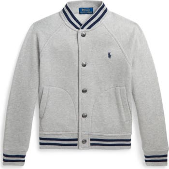 Plush cotton-blend fleece brings cozy comfort to a bomber jacket that's sized for kids and designed for looking sporty and staying warm when the temperatures fall. Striped ribbing frames the collar, cuffs and hem to add very varsity vibes to the easy-favorite look.