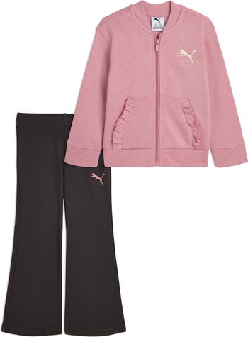 Ruffle trim and signature logos balance frilly and sporty on this cotton-blend jacket and flare leggings set made especially for kids.