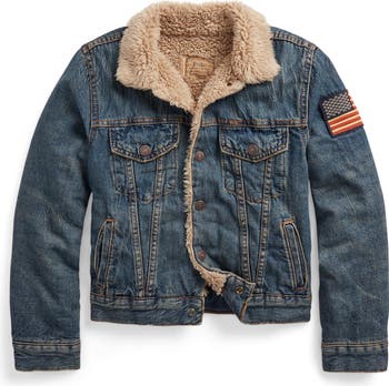 Plush, high-pile fleece spills out over the collar of a trucker jacket that's made of lightly faded cotton denim and sized for kids who like to look cool while they stay warm.