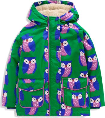 Plush fleece lining ups the cozy factor of this kid-size hooded jacket covered in a playful print that will brighten cold-weather days.