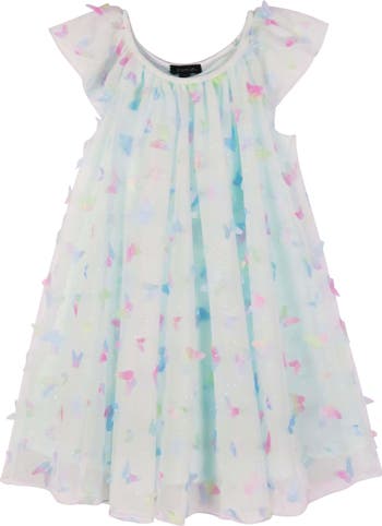 Weightless butterflies flit across this party-ready dress that's sure to enchant your little one with flutter sleeves and iridescent shimmer.
