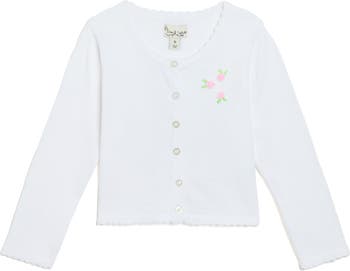 Dainty floral appliqués bring a pop of playfulness to this all-cotton cardigan made with sweetly scalloped trim.