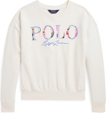 An appliquéd logo of garden flowers and pastel plaids heralds the new season on a sweatshirt made from cotton French terry.