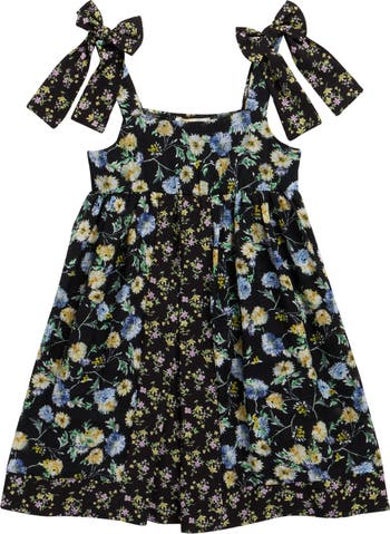 They'll love the bows that detail the straps of this flared sundress made with a mix of florals.
