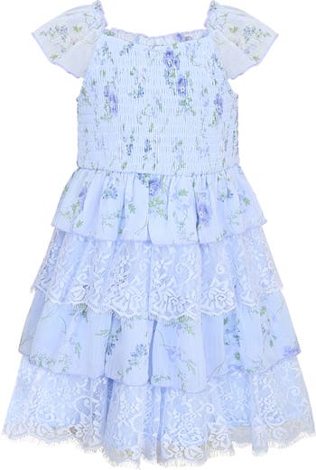 Crinkled floral chiffon mixes with airy lace on this floaty dress fitted with a comfy smocked bodice and a tiered skirt that will keep them twirling.