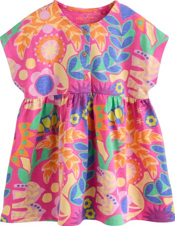 A bodacious riot of all that the sun sees covers a roomy cotton-jersey dress fashioned with short dolman sleeves and a henley placket.