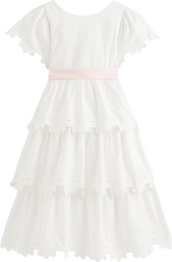 A pastel belt with a bow at the back adds a sweet finishing touch to this tiered dress featuring delicate floral cutouts.