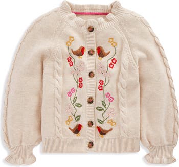 Birds and blooms flank the placket of this all-cotton cardigan that's accented with cables and ruffles for a sweet and happy look.