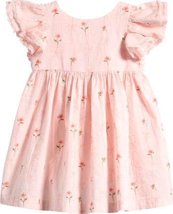 A bow is placed just above a back cutout that keeps your little one feeling breezy in this cotton sundress featuring tonal embroidery and a whimsical floral print.