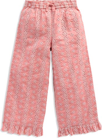 Delicate embroidered florals create an intricately detailed finish on these ruffle-hem pants designed with an elastic-drawstring waist in a pull-on style your kiddo can move in.