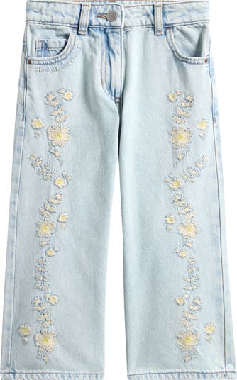 Vintage-style floral embroidery descends the legs of these faded wide-leg jeans they'll want to show off every day.