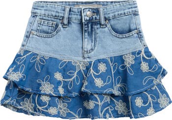 Contrast denim meets swirly floral embroidery on this tiered flounce skirt that gives your little trendsetter playful '80s-inspired flair.