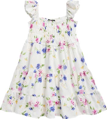 Subtle eyelet designs mingle with a vibrant floral print atop this smocked flutter-sleeve dress.