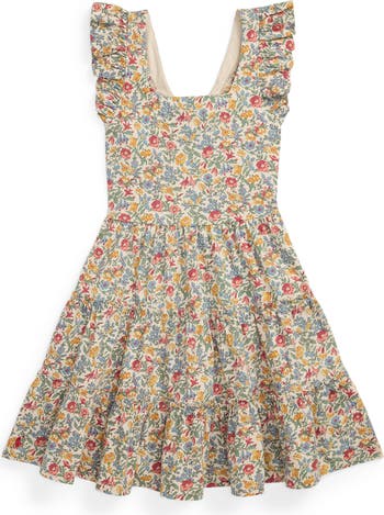 Dainty blooms brings retro homespun charm to this kid-sized cotton sundress fashioned with an adorable knotted back cutout and ruffled straps.