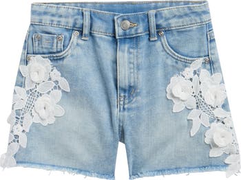 Intricate floral lace puts a sweet spin on these cutoff denim shorts that round out your kiddo's warm-weather wardrobe.