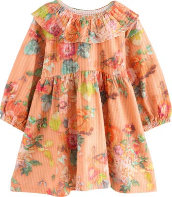 NEXT Kids' Floral Long Sleeve Cotton Seersucker Dress, Main, color, Orange