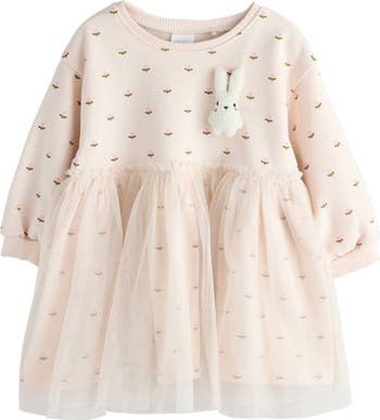 Storybook charm comes to live in this floral sweater dress made from a soft cotton blend and finished with a sweet bunny appliqué and mesh-overlaid skirt little ones will love to twirl in.