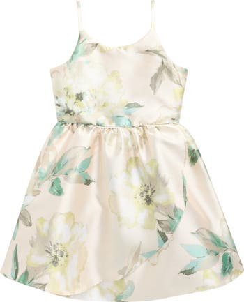Your kiddo can make a party-perfect entrance in this sleek mikado dress covered with painterly blooms that perfectly complement the tulip-style skirt.